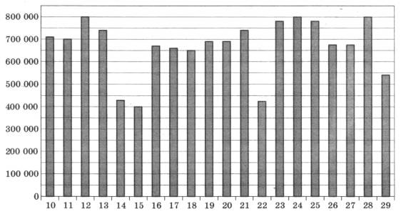 Задание 2. На диаграмме показано количество посетителей сайта РИА Новости во все дни с 10 по 29 ноября 2009 года. По горизонтали указываются дни месяца, по вертикали — количество посетителей сайта за данный день. Определите по диаграмме, какого числа количество посетителей сайта РИА Новости впервые приняло наибольшее значение.