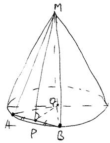 а) Докажите, что плоскость, проходящая через середину этой хорды и высоту конуса, перпендикулярна этой хорде.