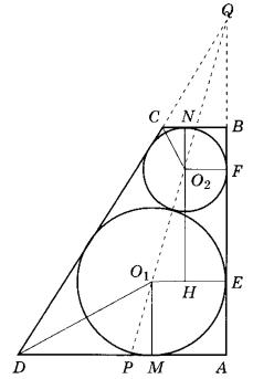 б) Пусть окружность с центром O1 радиуса R = 4/3 касается боковой стороны АВ в точке Е, а основания AD — в точке М; окружность радиуса r = 1/3 с центром O2 касается боковой стороны АВ в точке F, а основания ВС — в точке N.