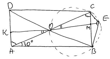 Задание 16. Диагональ АС прямоугольника ABCD с центром О образует со стороной АВ угол 30°. Точка Е лежит вне прямоугольника, причём угол BEC = 120°.