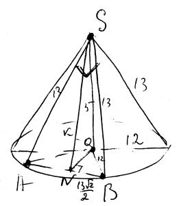 б) Расстояние от плоскости сечения до центра основания конуса O есть отрезок OK (см. рисунок). Сначала найдем длину отрезка AB из прямоугольного треугольника ABS. Отрезки AS=SB=13 и по теореме Пифагора имеем: