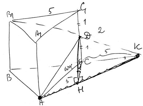 Задание 14. В правильной треугольной призме ABCA1B1C1 стороны основания равны 5, боковые рёбра равны 2, точка D — середина ребра СС1.