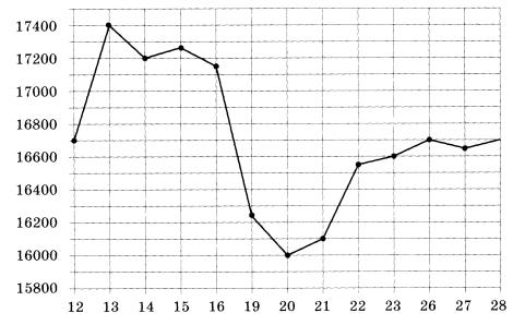 2 | На рисунке жирными точками показана цена олова на момент закрытия биржевых торгов во все рабочие дни с 12 по 28 ноября 2007 года. По горизонтали указываются числа месяца, по вертикали — цена тонны олова в долларах США. Для наглядности жирные точки на рисунке соединены линией. Определите по рисунку разность между наибольшей и наименьшей ценой олова на момент закрытия торгов в указанный период (в долларах США за тонну).