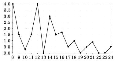 2 | На рисунке жирными точками показано суточное количество осадков, выпадавших в Томске с 8 по 24 января 2005 года. По горизонтали указываются числа месяца, по вертикали — количество осадков, выпавших в соответствующий день в миллиметрах. Для наглядности жирные точки на рисунке соединены линией. Определите по рисунку, какого числа в Томске впервые выпало ровно 0,5 миллиметра осадков.