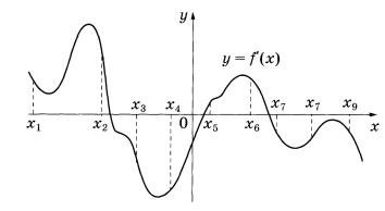7 | На рисунке изображён график у = f'(x) — производной функции f(x). На оси абсцисс отмечены девять точек: