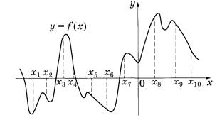 7 | На рисунке изображён график y = f'(x) — производной функции f(x). На оси абсцисс отмечено десять точек: x1, х2, х3, х4, х5, х6, х7, х8, х9, х10. Сколько из этих точек лежит на промежутках убывания функции f(x)?