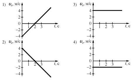 Задание 1. Координата тела меняется с течением времени согласно закону х = 4 - 2t, где все величины выражены в СИ. Какой из графиков отражает зависимость проекции скорости движения тела от времени?