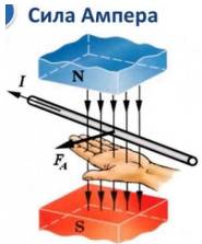 На проводник с током, помещенный в магнитное поле, действует сила Ампера, направление которой можно определить по правилу «левой руки» (см. рисунок).