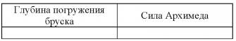 Задание 6. На поверхности воды плавает сплошной деревянный брусок. Как изменятся глубина погружения бруска и сила Архимеда, действующая на брусок, если его заменить сплошным бруском той же плотности и высоты, но большей массы?