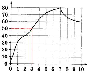 Чтобы определить время нагрева двигателя до 50 °С нужно соотнести отметку 50 по оси Oy с соответствующей отметкой на оси Ox, где отложено время разогрева. Из рисунка видно, что уровню 50 °С соответствует время 3 минуты (см. рисунок ниже).