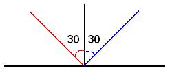 На рисунке ниже показано зеркало, расположенное горизонтально, падающий луч (красная линия) и отраженный луч (синяя линия).