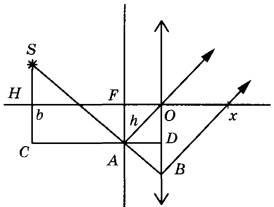 Задание 32. Главная оптическая ось тонкой собирающей линзы с фокусным расстоянием F = 20 см и точечный источник света S находятся в плоскости рисунка. Точка S находится на расстоянии b = 70 см от плоскости линзы и на расстоянии Н = 5 см от её главной оптической оси. В левой фокальной плоскости линзы находится тонкий непрозрачный экран с малым отверстием А, находящимся в плоскости рисунка на расстоянии h = 4 см от главной оптической оси линзы. На каком расстоянии x от плоскости линзы луч SA от точечного источника, пройдя через отверстие в экране и линзу, пересечет её главную оптическую ось? Дифракцией света пренебречь. Постройте рисунок, показывающий ход луча через линзу.