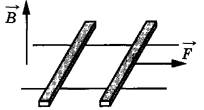 31 | По горизонтально расположенным проводящим шероховатым рельсам с пренебрежимо малым сопротивлением могут скользить два одинаковых стержня массой m = 50 г и сопротивлением R = 0,3 Ом каждый. Расстояние между рельсами l = 15 см, а коэффициент трения между стержнями и рельсами μ = 0,15. Рельсы со стержнями находятся в однородном вертикальном магнитном поле с индукцией В = 1 Тл (см. рисунок). Под действием горизонтальной силы, действующей на первый стержень вдоль рельс, оба стержня движутся поступательно равномерно с разными скоростями. Какова скорость движения первого стержня относительно второго? Самоиндукцией контура пренебречь.