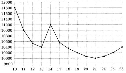 Задание 2. На рисунке жирными точками показана цена никеля на момент закрытия биржевых торгов во все рабочие дни с 10 по 26 ноября 2008 года. По горизонтали указываются числа месяца, по вертикали — цена тонны никеля в долларах США. Для наглядности жирные точки на рисунке соединены линией. Определите по рисунку разность между наибольшей и наименьшей ценой никеля на момент закрытия торгов в указанный период (в долларах США за тонну).