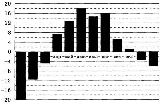 Задание 2. На диаграмме показана среднемесячная температура воздуха в Екатеринбурге (Свердловске) за каждый месяц 1973 года. По горизонтали указываются месяцы, по вертикали — температура в градусах Цельсия. Определите по приведённой диаграмме, сколько месяцев среднемесячная температура превышала 14 градусов Цельсия.