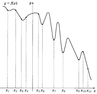 7 | На рисунке изображён график функции у = f(x) и одиннадцать точек на оси абсцисс: x1, х2, х3, х4, х6, х7, x8, x9, x10, х11. В скольких из этих точек производная функции f(x) отрицательна?