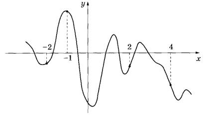 7 | На рисунке изображён график функции у = f(x). На оси абсцисс отмечены точки -2, -1, 2, 4. В какой из этих точек значение производной наибольшее? В ответе укажите эту точку.