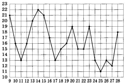 2 | На рисунке жирными точками показана средняя температура воздуха в Калининграде во все дни с 9 по 28 апреля 2018 года. По горизонтали указываются числа месяца, по вертикали — средняя температура в градусах Цельсия. Для наглядности точки на рисунке соединены линией.
