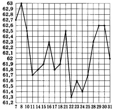 2 | На графике жирными точками показан курс доллара, установленный Центробанком РФ, на все рабочие дни с 7 мая по 31 мая 2018 года. По горизонтали указываются числа месяца, по вертикали — цена доллара в рублях. Для наглядности точки соединены линиями.