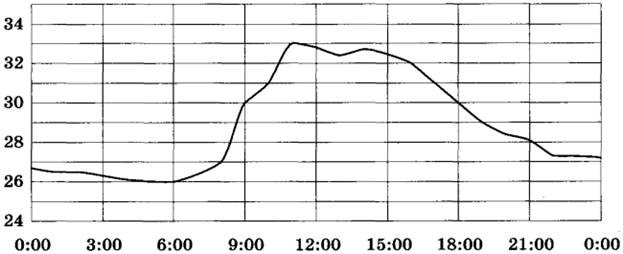Задание 11. На рисунке показано, как изменялась температура воздуха на протяжении одних суток. По горизонтали указано время суток, по вертикали — значение температуры в градусах Цельсия. Сколько часов в первой половине суток температура превышала 30 °С?