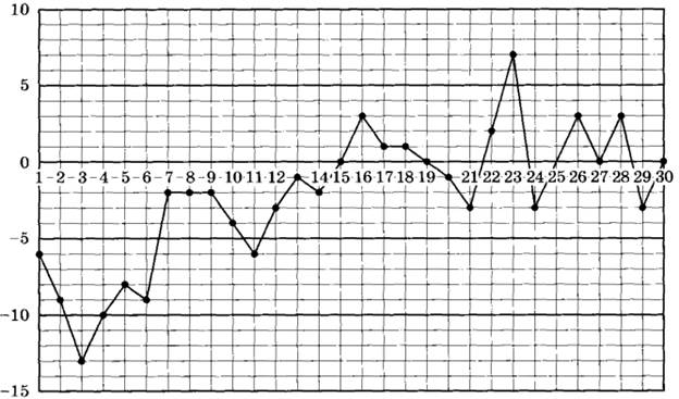 11 | На рисунке жирными точками показана средняя температура воздуха в Якутске во все дни апреля 2018 года. По горизонтали указываются числа месяца, по вертикали — средняя температура в градусах Цельсия. Для наглядности точки на рисунке соединены линией.