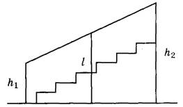 8 | Перила лестницы дачного дома для надёжности укреплены посередине вертикальным столбом. Найдите высоту l этого столба, если наименьшая высота h1 перил равна 2,1 м, а наибольшая высота h2 равна 3,1 м. Ответ дайте в метрах.