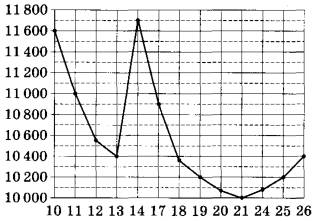 11 | На рисунке жирными точками показана цена никеля на момент закрытия биржевых торгов во все рабочие дни с 10 по 26 ноября 2008 года. По горизонтали указываются числа месяца, по вертикали — цена тонны никеля в долларах США. Для наглядности жирные точки на рисунке соединены линией. Определите по рисунку, какого числа цена никеля на момент закрытия торгов впервые за данный период приняла значение 10 200 долларов США за тонну.