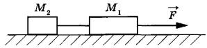Задание 25. Два груза, связанные нерастяжимой и невесомой нитью, движутся по гладкой горизонтальной поверхности под действием постоянной горизонтальной силы F приложенной к грузу М1 = 2 кг (см. рисунок). Нить обрывается при значении силы натяжения нити 4 Н, при этом модуль силы F равен 12 Н. Чему равна масса второго груза М2?