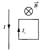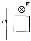 Задание 28. Прямолинейный проводник с током и проводящая рамка лежат в плоскости, перпендикулярной линиям индукции однородного магнитного поля. Опираясь на законы физики, укажите направление силы, действующей на рамку, когда величина магнитной индукции B уменьшается.