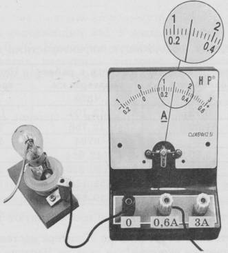 Задание 22. Чему равна сила тока в лампочке (см. рисунок), если погрешность прямого измерения силы тока амперметром на пределе измерения 3 А равна ∆I1 = 0,15 А, а на пределе измерения 0,6 А равна ∆I2 = 0,03 А?