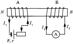1. При протекании электрического тока по катушке А в пространстве возникает магнитное поле, которое пронизывает сердечник из железа, создавая в нём магнитный поток Ф1. Сердечник с намотанной на него катушкой А образует электромагнит. При этом, исходя из обозначений полюсов источника и правила буравчика, у левого торца катушки А находится северный полюс этого магнита (см. рисунок).