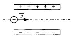 которой частица должна влететь в конденсатор, чтобы затем вылететь из него, v = 5 м/с. Длина пластин