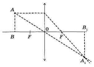 1. Построим изображение источника света в линзе. Изображением светящейся точки А в некоторый момент времени будет точка A1. Введём обозначения: радиус окружности, по которой движется источник света, r = AB; радиус окружности, по которой движется изображение источника света, R = А1В1; расстояние OB = d; расстояние OB1 = f; фокусное расстояние линзы OF = F.
