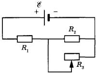 Задание 17. На рисунке показана цепь постоянного тока, содержащая источник тока с ЭДС E, два резистора и реостат. Сопротивления резисторов R1 и R2 одинаковы и равны R. Сопротивление реостата R3 можно менять. Как изменятся напряжение на резисторе R2 и суммарная тепловая мощность, выделяемая во внешней цепи, если уменьшить сопротивление реостата от R до 0? Внутренним сопротивлением источника пренебречь.