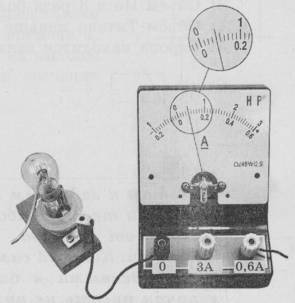 Из рисунка видно, схема подключена к клемме 0,6 А и показания снимаются с нижней шкалы. Цена одного деления этой шкалы составляет 0,2:10=0,02 А. Стрелка показывает значение 0,08 А, и имеем показания 0,08±0,02 А.