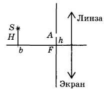 Задание 32. Главная оптическая ось тонкой собирающей линзы с фокусным расстоянием F = 20 см и точечный источник света S находятся в плоскости рисунка. Точка S находится на расстоянии b = 70 см от плоскости линзы и на расстоянии Н = 5 см от её главной оптической оси. В левой фокальной плоскости линзы лежит тонкий непрозрачный экран с маленьким отверстием А, находящимся в плоскости рисунка на расстоянии h = 4 см от главной оптической оси линзы. На каком расстоянии x от плоскости линзы луч SA от точечного источника, пройдя через отверстие в экране и линзу, пересечёт её главную оптическую ось? Дифракцией света пренебречь. Постройте рисунок, показывающий ход луча через линзу.