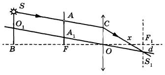 1. Построим ход луча SACS1, прошедшего через экран и собирающую линзу, используя основные свойства тонкой линзы: параллельный пучок лучей, падающих на линзу, собирается в её фокальной плоскости; луч O1OS1, прошедший через оптический центр линзы (точку O), не преломляется.