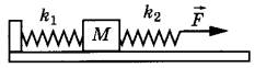 Задание 2. К системе из кубика массой М = 1 кг и двух пружин приложена постоянная горизонтальная сила F величиной 12 Н (см. рисунок). Между кубиком и опорой трения нет. Система покоится. Жёсткость первой пружины k1 = 400 Н/м. Жёсткость второй пружины k2 = 600 Н/м. Каково удлинение первой пружины?