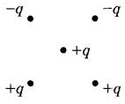 13 | Куда направлена относительно рисунка (вправо, влево, вверх, вниз, к наблюдателю, от наблюдателя) кулоновская сила F, действующая на положительный точечный заряд +q, помещённый в центр квадрата, в вершинах которого находятся заряды: +q, +q, -q, -q (см. рисунок)? Ответ запишите словом (словами).