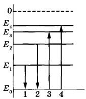 21 | На рисунке изображена упрощённая диаграмма нижних энергетических уровней атома. Нумерованными стрелками отмечены некоторые возможные переходы атома между этими уровнями. Какой из этих четырёх переходов связан с излучением света наименьшей частоты, а какой — с поглощением света наибольшей частоты?