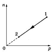 11 | При переводе идеального газа из состояния 1 в состояние 2 концентрация молекул n пропорциональна давлению p (см. рисунок). Масса газа в процессе остаётся постоянной.