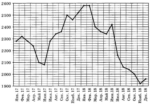 Задание 2. На рисунке показана средняя цена свинца во все месяцы 2017 и 2018 годов. По горизонтали указаны месяцы, по вертикали — цена тонны свинца в долларах США. Для наглядности точки соединены отрезками.