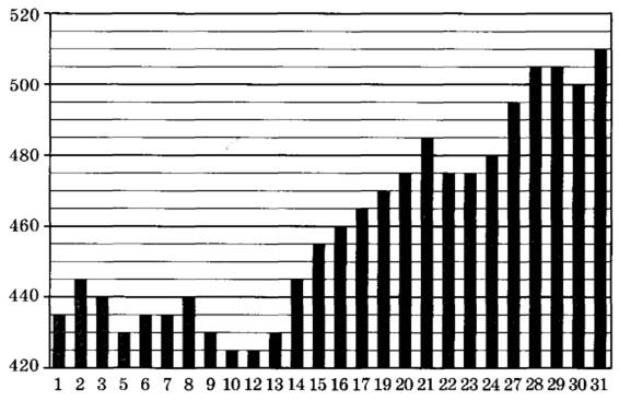 Задание 2. На диаграмме показана цена пшеницы на момент закрытия биржи во все торговые дни мая 2019 года. По горизонтали указаны числа месяца, по вертикали — цена 100 бушелей пшеницы в долларах США.