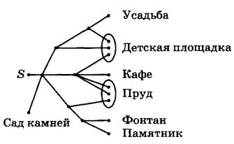 4 | Артём гуляет по парку. Он выходит из точки S и, дойдя до очередной развилки, с равными шансами выбирает следующую дорожку, но не возвращается обратно. Найдите вероятность того, что таким образом он выйдет к пруду или фонтану.