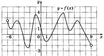 7 | На рисунке изображён график у = f’(x) — производной функции f(x), определённой на интервале (-6; 9). Найдите количество точек максимума функции f(x), принадлежащих отрезку [-3; 7].