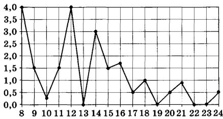 2 | На рисунке жирными точками показано суточное количество осадков, выпадавших в Томске с 8 по 24 января 2005 года. По горизонтали указываются числа месяца, по вертикали — количество осадков, выпавших в соответствующий день в миллиметрах. Для наглядности жирные точки на рисунке соединены линией. Определите по рисунку, какого числа в Томске впервые выпало ровно 0,5 миллиметра осадков.