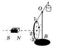 Задание 18. Медное кольцо на горизонтальном коромысле поворачивается вокруг вертикальной оси ОВ под действием движущегося магнита (см. рисунок).