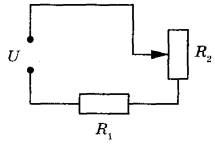 Задание 17. Резистор R1 и реостат R2 подключены последовательно к источнику напряжения U (см. рисунок). Как изменятся сила тока в цепи и напряжение на резисторе R1, если ползунок реостата переместить до конца вверх? Считать, что напряжение на выводах источника остаётся при этом прежним.