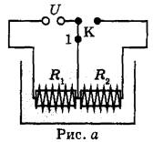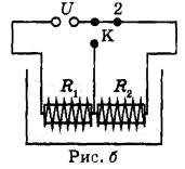 Задание 27. В сосуд наливают воду при комнатной температуре. В воду погружают нагревательные элементы с сопротивлениями R1 и R2 подключённые к источнику постоянного напряжения так, как показано на рис. а. Оставив ключ в положении 1, доводят воду до кипения. Затем кипяток выливают, сосуд охлаждают до комнатной температуры, вновь наполняют таким же количеством воды при комнатной температуре и, повернув ключ К в положение 2 (рис. б), повторяют опыт. Напряжение источника в опытах одинаково. Опираясь на законы электродинамики и молекулярной физики, объясните, в каком из приведённых опытов вода закипит быстрее.