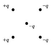 Задание 13. Как направлена относительно рисунка (вправо, влево, вверх, вниз, к наблюдателю, от наблюдателя) сила Кулона F, действующая на отрицательный точечный заряд -q, помещённый в центр квадрата, в вершинах которого находятся заряды: +q, +q, -q, -q (см. рисунок)? Все заряды неподвижны. Ответ запишите словом (словами).